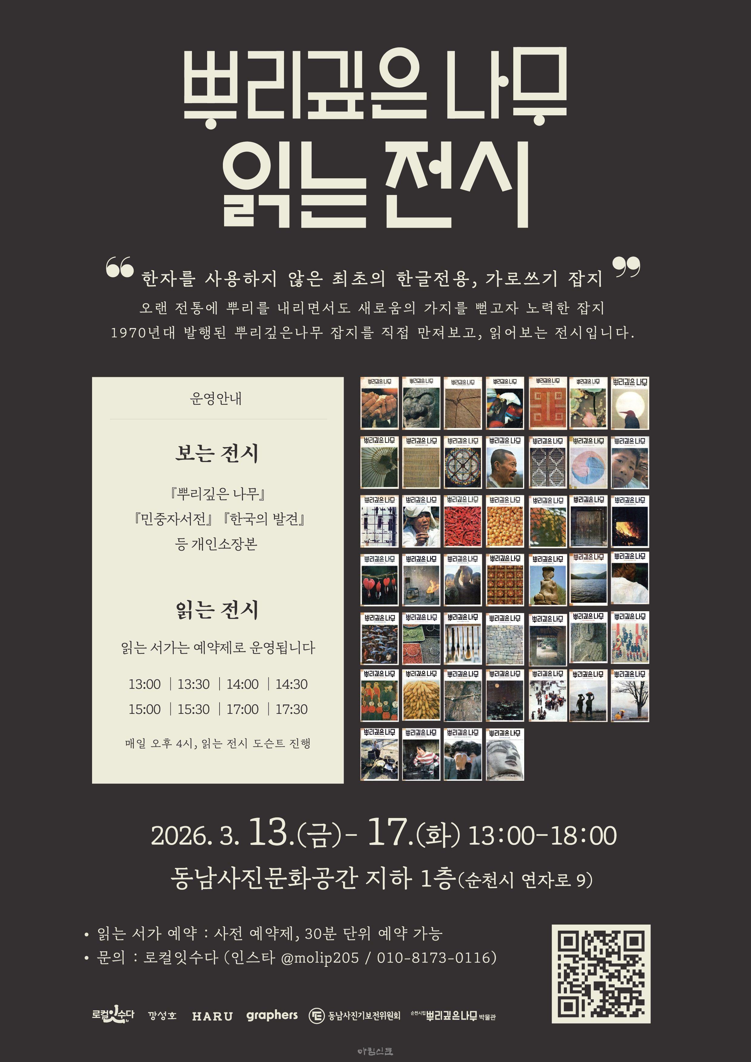 ¡®»Ñ¸®±íÀº ³ª¹« Àд Àü½Ã¡¯°¡ ¿À´Â 3¿ù 13ÀϺÎÅÍ 17ÀϱîÁö ¼øÃµ µ¿³²»çÁø¹®È°ø°£ ÁöÇÏ 1Ãþ¿¡¼ °³ÃֵȴÙ. ±¹¸³¼øÃµ´ëÇб³ °¼ºÈ£ Çмú¿¬±¸±³¼ö¸¦ ºñ·ÔÇØ Áö¿ª¿¡¼ Ȱµ¿ÇÏ´Â ¿¬±¸ÀÚ¿Í ±âȹÀÚ, µðÀÚÀ̳Ê, »çÁø±³À°°¡ µîÀÌ ÇÔ²² ±âȹ¡¤¿î¿µÇÑ´Ù.
