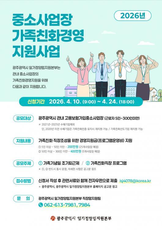 »ç¾÷ ½ÅûÀº 10ÀÏ ¿ÀÀü 9½ÃºÎÅÍ 24ÀÏ ¿ÀÈÄ 6½Ã±îÁö ÀüÀÚ¸ÞÀÏ·Î Á¢¼öÇÑ´Ù. ÀÚ¼¼ÇÑ ³»¿ëÀº ±¤ÁÖ½Ã¿Í ±¤ÁÖÀϰ¡Á¤¾ç¸³Áö¿øº»ºÎ ´©¸®Áý¿¡¼ È®ÀÎÇϰųª Àϰ¡Á¤¾ç¸³Áö¿øº»ºÎ Á÷À帾Áö¿øÆÀÀ¸·Î ¹®ÀÇÇÏ¸é µÈ´Ù.