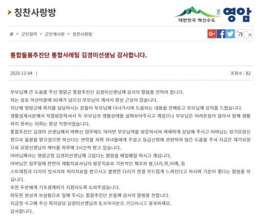 ¾Æ¿ï·¯ 1ÁÖÀÏ¿¡ 2ȸ¾¿ ÅëÇÕ»ç·Ê°ü¸®»çÀÇ Á¤±â °¡Á¤ ¹æ¹®À¸·Î µÎ ¾î¸£½Å¿¡°Ô Áö¿ª º¹ÁöÀÚ¿øÀ» ¿¬°èÇØ ÁÖ°í ÀÖ´Ù.