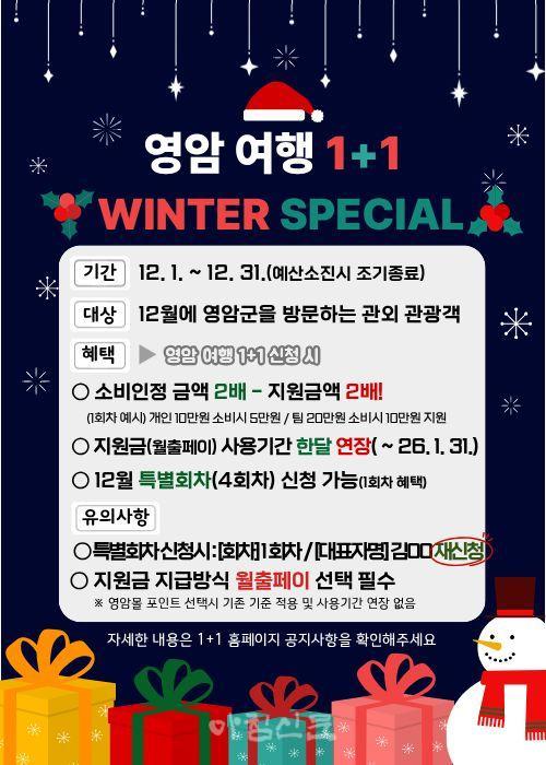 [¿µ¾Ï/»çȸ]¹®±Ù¹Ì ±âÀÚ = ¿µ¾Ï±º(±º¼ö ¿ì½ÂÈñ)ÀÌ ¿¬¸» Áö¿ª °ü±¤ ¼ö¿ä °ßÀÎÀ» À§ÇØ 12¿ù ÇÑ ´Þ µ¿¾È ¡®¿µ¾Ï¿¡¼­ Áñ±â´Â ¼³»ê°¡»ê À̺¥Æ®¡¯·Î ¡®¿µ¾Ï¿©Çà 1+1¡¯ ÇýÅÃÀ» ´ëÆø ´Ã¸°´Ù.
