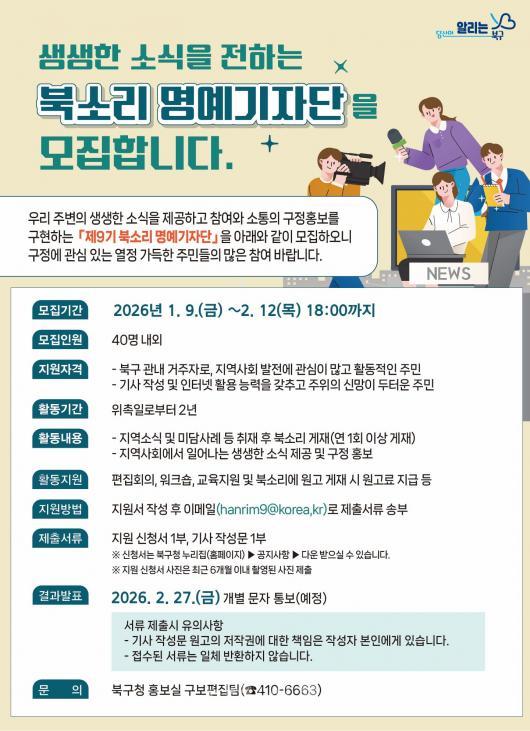 À̹ø ¸ðÁý¿¡¼´Â Á¦9±â ¸í¿¹±âÀÚ´Ü 40¿© ¸íÀ» ¼±¹ßÇÒ °èȹÀÌ´Ù. Áö¿ª»çȸ¿¡ °ü½ÉÀÌ ¸¹°í ±â»ç ÀÛ¼º ¹× ÀÎÅÍ³Ý È°¿ë ´É·ÂÀ» °®Ãá ºÏ±¸ ÁÖ¹ÎÀ̶ó¸é ´©±¸³ª ½ÅûÇÒ ¼ö ÀÖ´Ù.